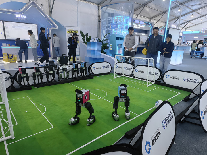 机械人正在第八届世界声博会长进行脚球角逐(11月3日摄)。